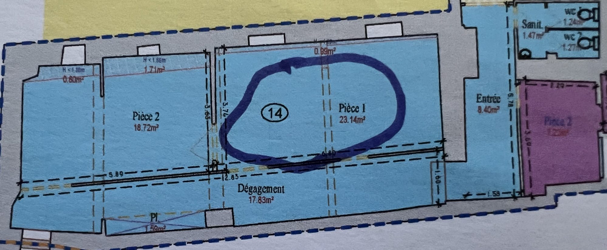 L’appartement se compose actuellement d’une entrée, d'un grand salon/séjour, d'une très grande chambre avec possibilité d'en faire une seconde, un dégagement avec placard, un espace sanitaire avec deux wc.